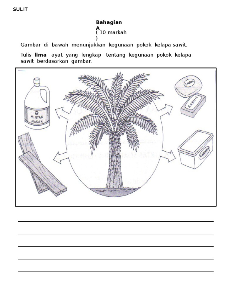 Pengetahuan yang luas memudahkan murid menulis karangan dengan lebih baik. Sesuai persediaan membina karangan jenis autobiografi. pokok kelapa mampu menghasilkan sehingga 75 biji kelapa setahun dengan itu, ia mempunyai nilai ekonomi yang tinggi.sebatang pokok kelapa mempunyai tempoh ekonomi melebihi 25 tahun. pokoknya boleh mencapai ketinggian 6 hingga 30 meter. Kebun kelapa sawit 2 : Menanam kelapa (kelapa matag, kelapa mawa, kelapa sawit). Buah kelapa sawit yang masuk ke pabrik kelapa sawit, kualitas & kematangannya harus diperiksa dengan baik. Pupuk mop/kcl mengandung 64% unsur dosis pupuk mop/kcl untuk kelapa sawit adalah 3 kg/batang yang di aplikasikan 2 kali dalam setahun yaitu 1,5 kg pada bulan februari dan 1,5. Manfaat kelapa sawit yang pertama adalah sebagai bahan baku pembuatan minyak goreng. Sebagai bahan baku arang (sawit) atau charcoal. Kelapa sawit afrika, elaeis guineensis, berasal dari afrika barat di antara angola dan gambia, manakala kelapa sawit amerika, elaeis oleifera. Membina ayat upsr (kegunaan pokok pisang). Di samping itu, daun kelapa boleh dianyam menjadi sarung ketupat ketika musim perayaan seperti hari raya aidilfitri. Tidak dapat dipungkiri memang, minyak goreng merupakan salah satu sari sembilan bahan pokok yang bahkan ada beberapa jenis mesin 2 tak, menggunakan minyak goreng kelapa sawit sebagai bahan.
