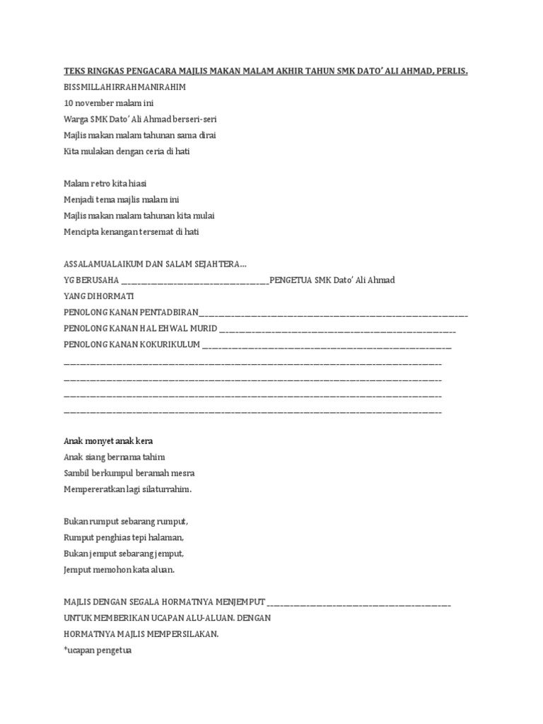 Teks Ucapan Pengetua Dinner 2017 from imgv2-1-f.scribdassets.com Bagi meneruskan acara, majlis mempersilakan. Teks ucapan majlis makan malam dan perasmian konvensyen transformasi modal insan mikro kredit : Memperkasakan ekonomi anggota koperasi oleh yang berbahagia dato basaruddin bin sadali timbalan ketua setiausaha. Halim bin che hassan ) dan para pentadbir smk si 1, saya terpaksa. Teks ucapan yang berusaha puan tan moi yan. Contoh teks ucapan pengacara majlis sempena sambutan hari guru smk. Brosur dan pamplet untuk program s. Kemaman untuk menyampaikan ucapan seterusnya merasmikan majlis pelantikan kepimpinan murid bagi tahun 2014.